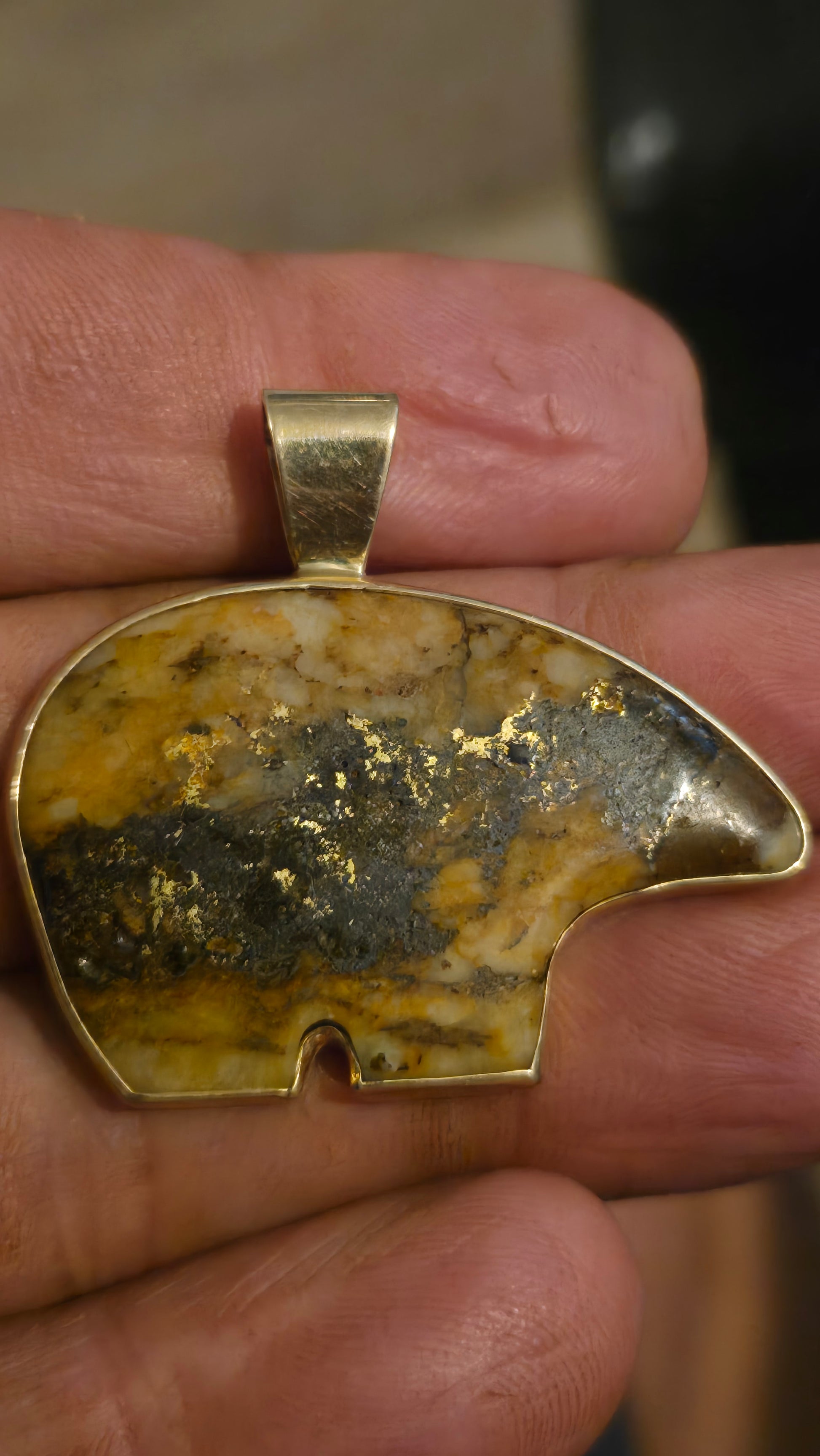 This is a beautiful 14 karat gold painting it is in the shape of a bear and it is 14.45 G and I have it for sale super cheap.