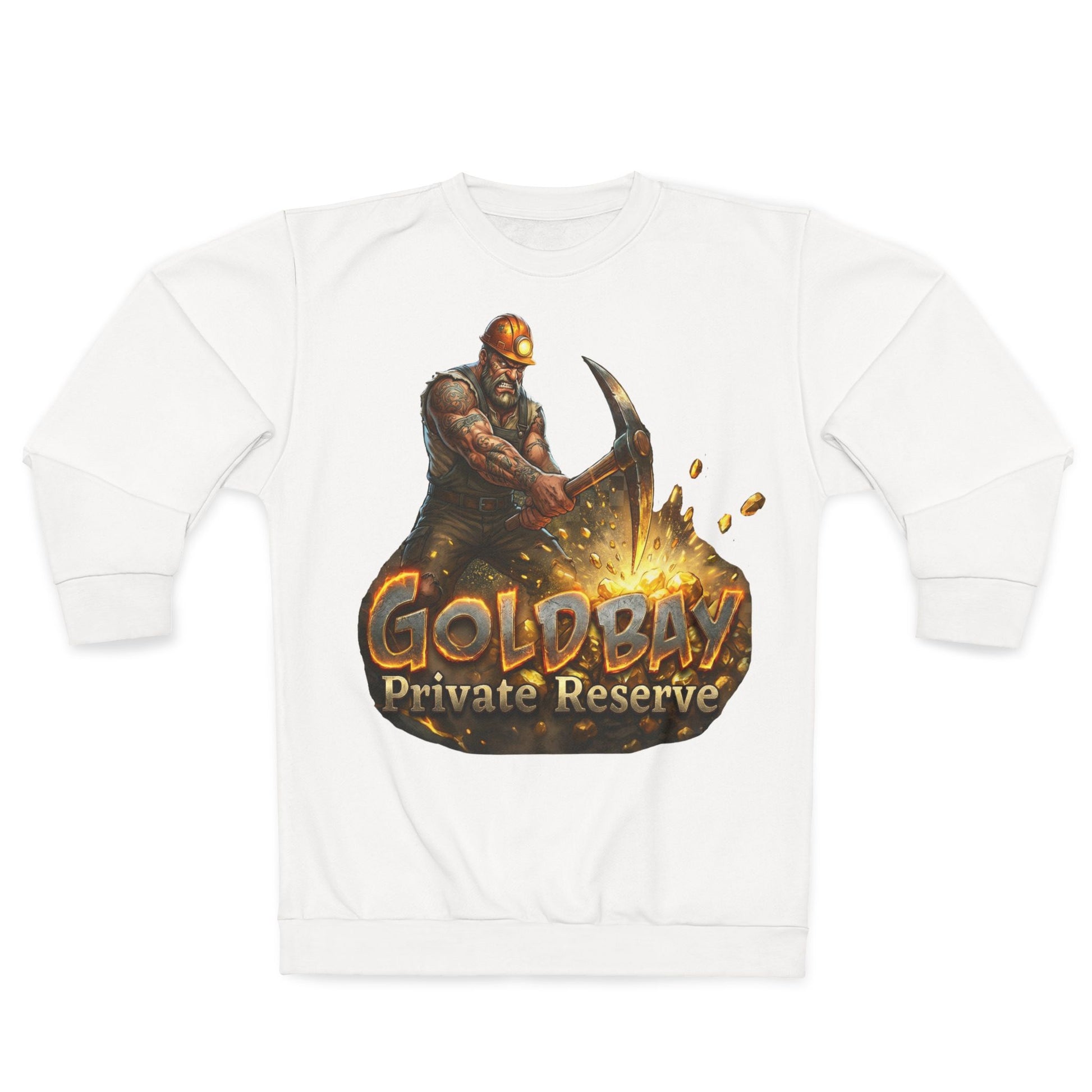 This Crewneck Sweatshirt brings the grit of the mine to your everyday wear. A bold, full-coverage print shows a rugged prospector striking gold, its molten glow and flying sparks rendered in bright, intense colors that pop across the fabric. The medium-weight polyester keeps the print vivid while staying durable and quick-drying, and the 1x1 ribbed cuffs and collar hold their shape through wear. Wear it during long gaming sessions, at meetups, or around the cabin when you want a statement piece that feels lived-in and adventurous. It sits comfortably in a classic fit and is custom cut and sewn so the artwork lays true across the front — a sweatshirt that looks like it came straight from the vault.